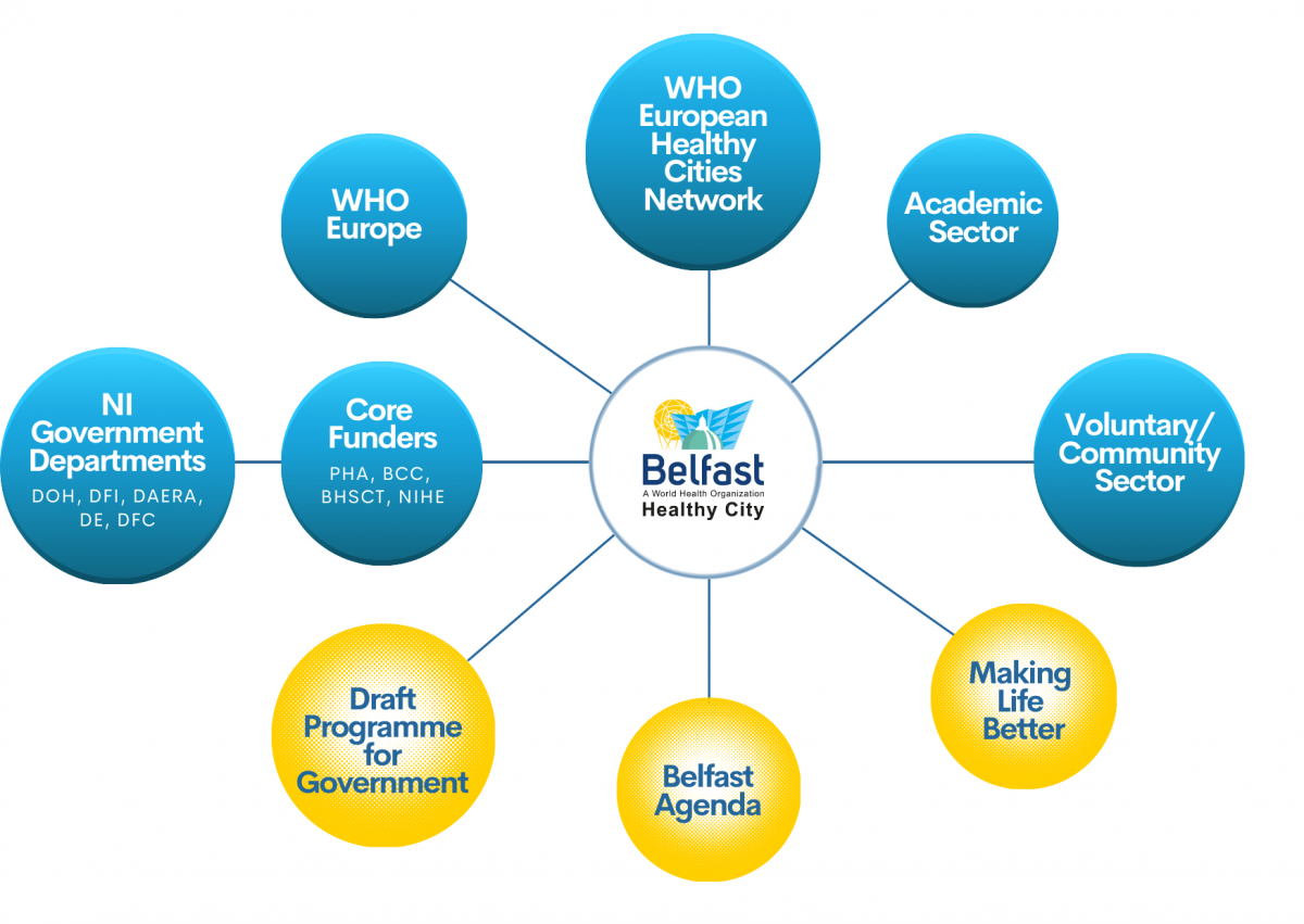 Belfast Healthy Cities, will work with stakeholders from government departments, universities, the private, public, voluntary and community sectors and within the local and regional context during Phase VII.