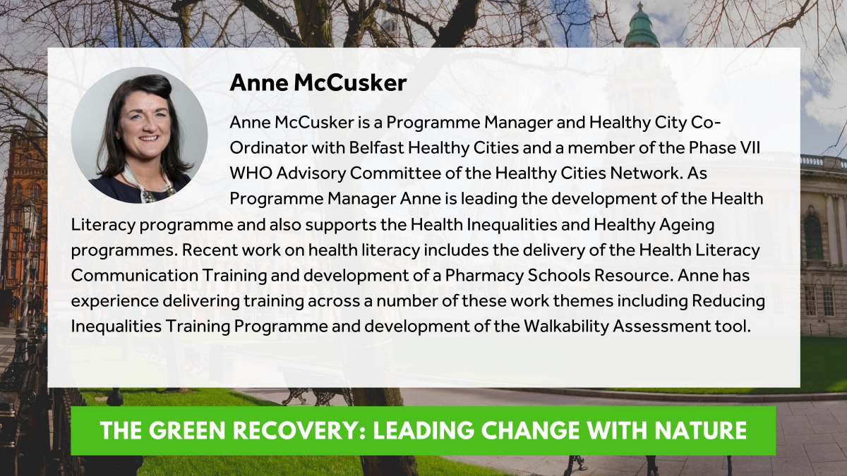 The Green Recovery - Leading the way through Nature is the lastest Belfast Healthy Cities Seminar, which looks at how improving nature and green space in our urban areas brings health and wellbeing benefits, alongside environmental improvements.