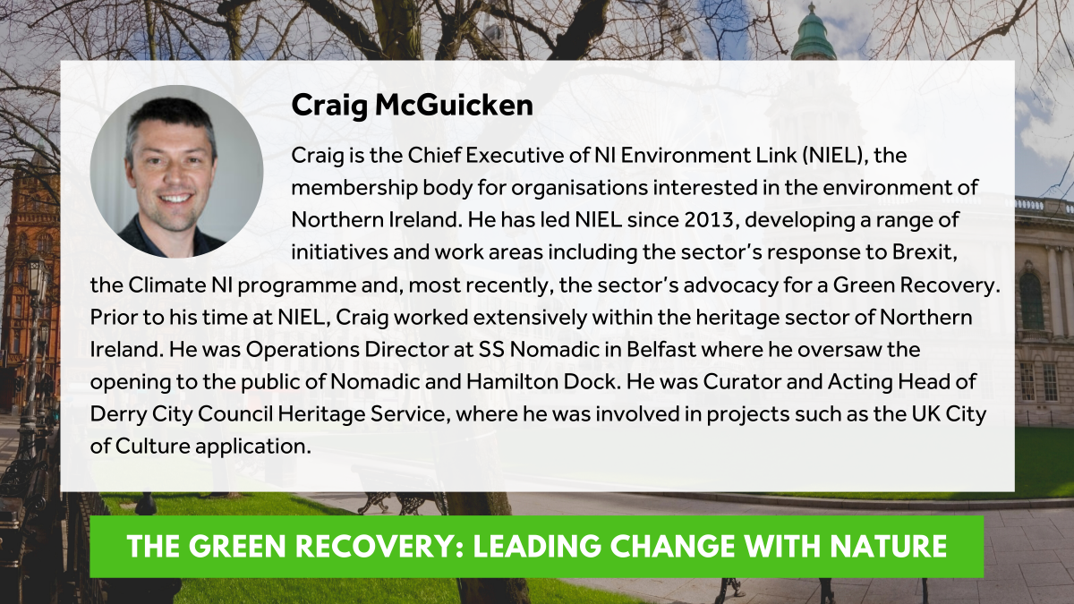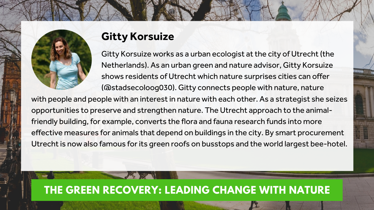 The seminar heard from Craig McGuicken from Northern Ireland Environment Link who presented their Green Recovery - 5 Point Plan for N Ireland, Gitty Korsuize from City of Utrecht who spoke on Rewilding Utrecht, and Anne McCusker from Belfast Healthy Cities presenting Creating space for healthy places.